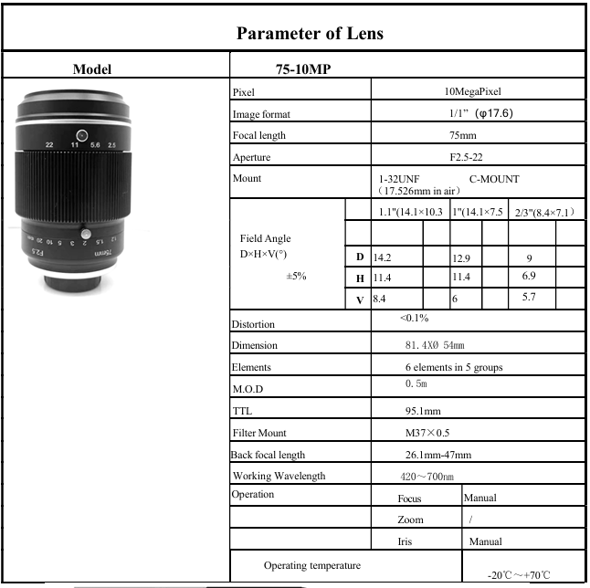 75mm Lens 1.1 Inch sensor